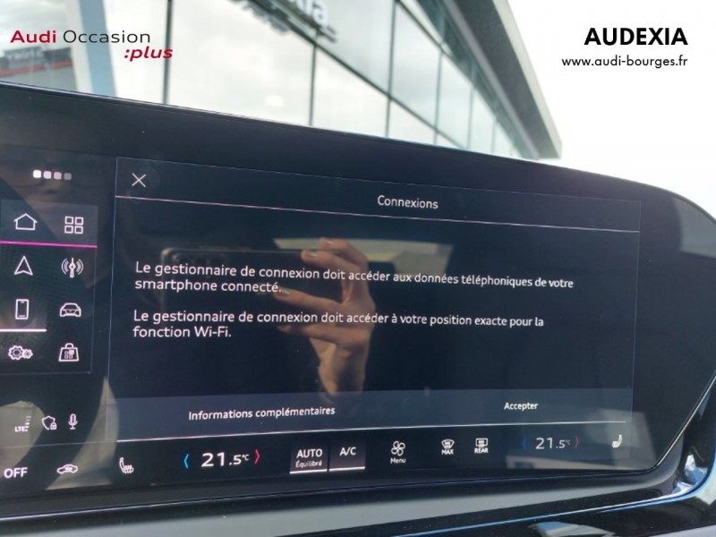 Pack Tech – Caméra de recul – Régulateur de vitesse adaptatif – Park assist plus – Système d'aide au stationnement plus – Projecteurs à LED plus – Assistant feux de route – Bloc de feux AR à LED pro – Climatisation automatique 3 zones – Rétroviseur intérieur à réglage jour/nuit automatique – Rétroviseurs ext. réglables – Projection de logo sur le sol depuis les rétroviseurs extérieurs – Audi sound system – Audi Application Store et smartphone interface