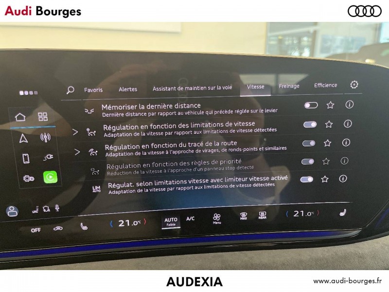 Pack Tech Plus – Pack Tech – Sonorité éxtérieur – Sièges AV réglables électriquement – Fonction mémoire pour le siège du conducteur et les rétroviseurs extérieurs – Écran MMI pour passager AV – Projecteurs Matrix LED – Signatures lumineuses numériques – Alerte de sortie de voie avec pilotage semi-automatique – Assist. de changement de voie et avertissement d'ouverture de porte, assistant de circulation transversale AR et assistant de braquage AR – Assistant de conduite adaptatif plus – Airbags